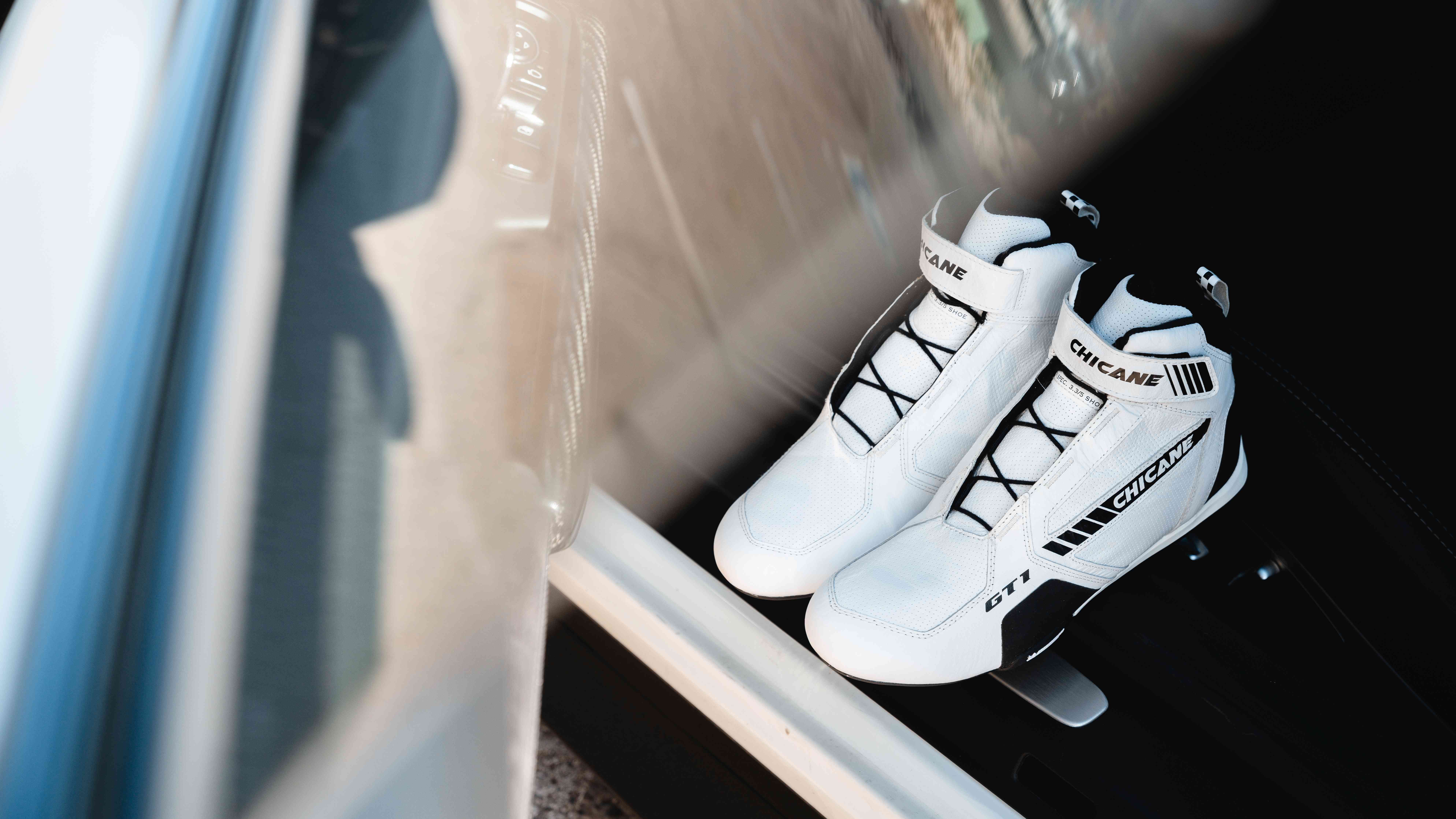 GT1 lightweight professional racing shoes in white with kangaroo leather construction and Michelin performance soles placed in a race car cockpit, designed for maximum pedal feel, breathability, fire-resistant protection, and precision control for competitive and advanced drivers.